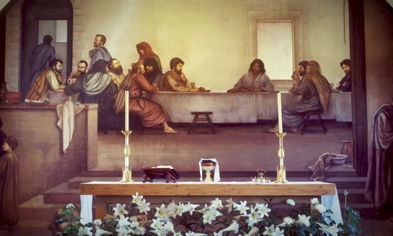 In 1980 Ben Long painted the fresco “The Lord’s Supper” behind the Altar at Holy Trinity. Long and 20 of his students spent three months completing the fresco while the church was still undergoing renovations. Area residents began taking an interest in what was taking place and were supportive of the work. The churches of the community (regardless of denomination) offered to feed the artists – creating a bit of competition for the best meal served. Local people served as models for all the biblical figures except the waiting maid, Judas, Thomas, and Christ. Benjamin F. Long was the model for Thomas. In a scrip at the right of the foot-washing bowl, Benjamin F. Long painted a dedication to his father, who died just as the fresco was being completed.
